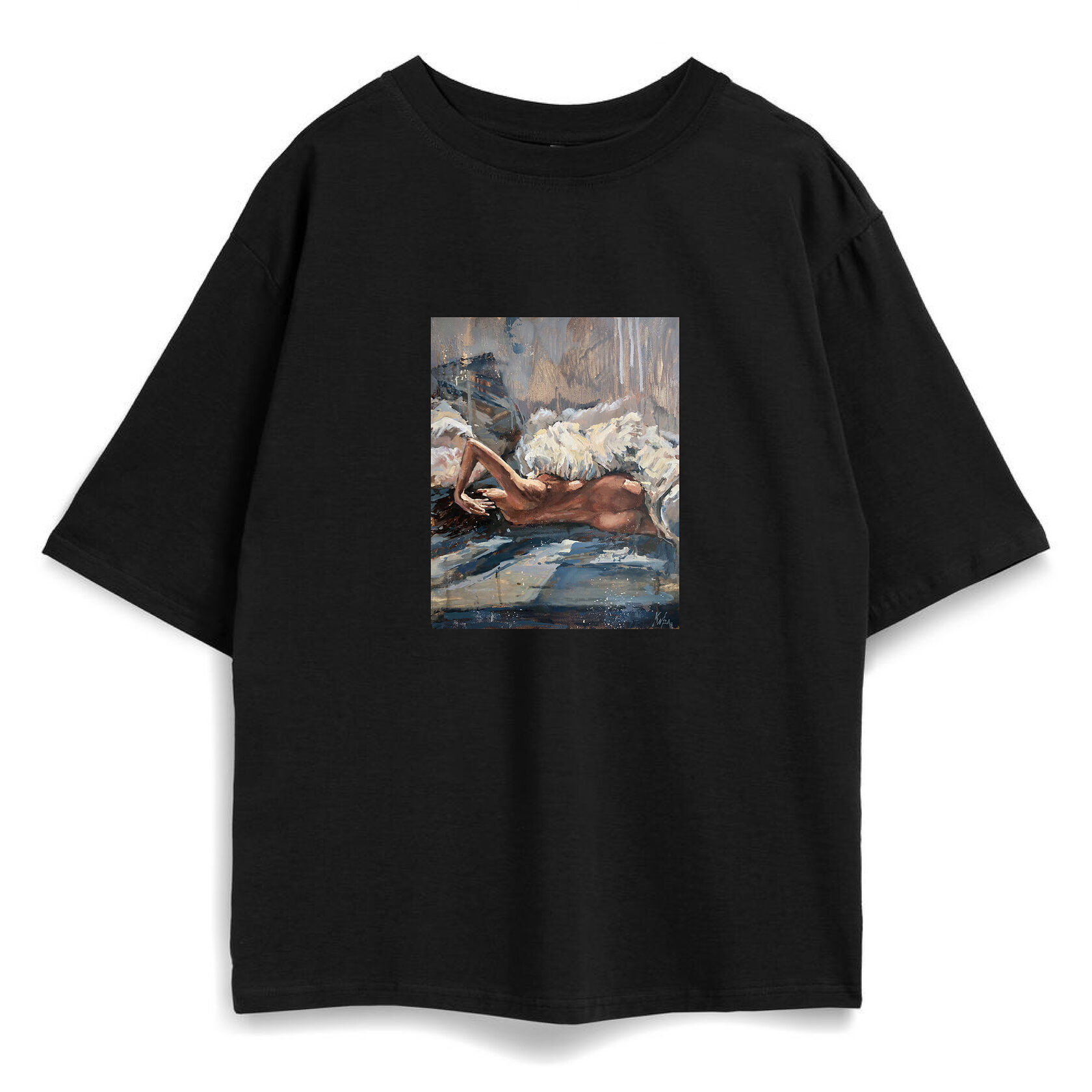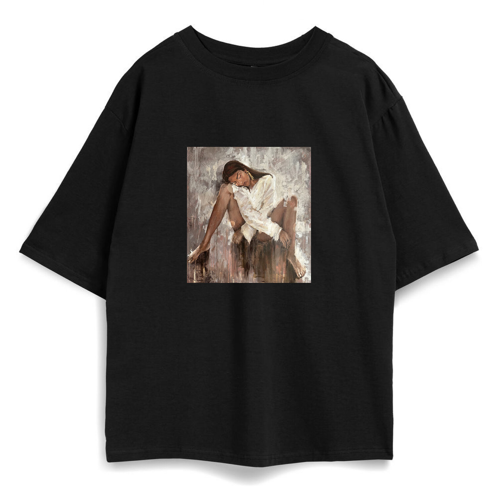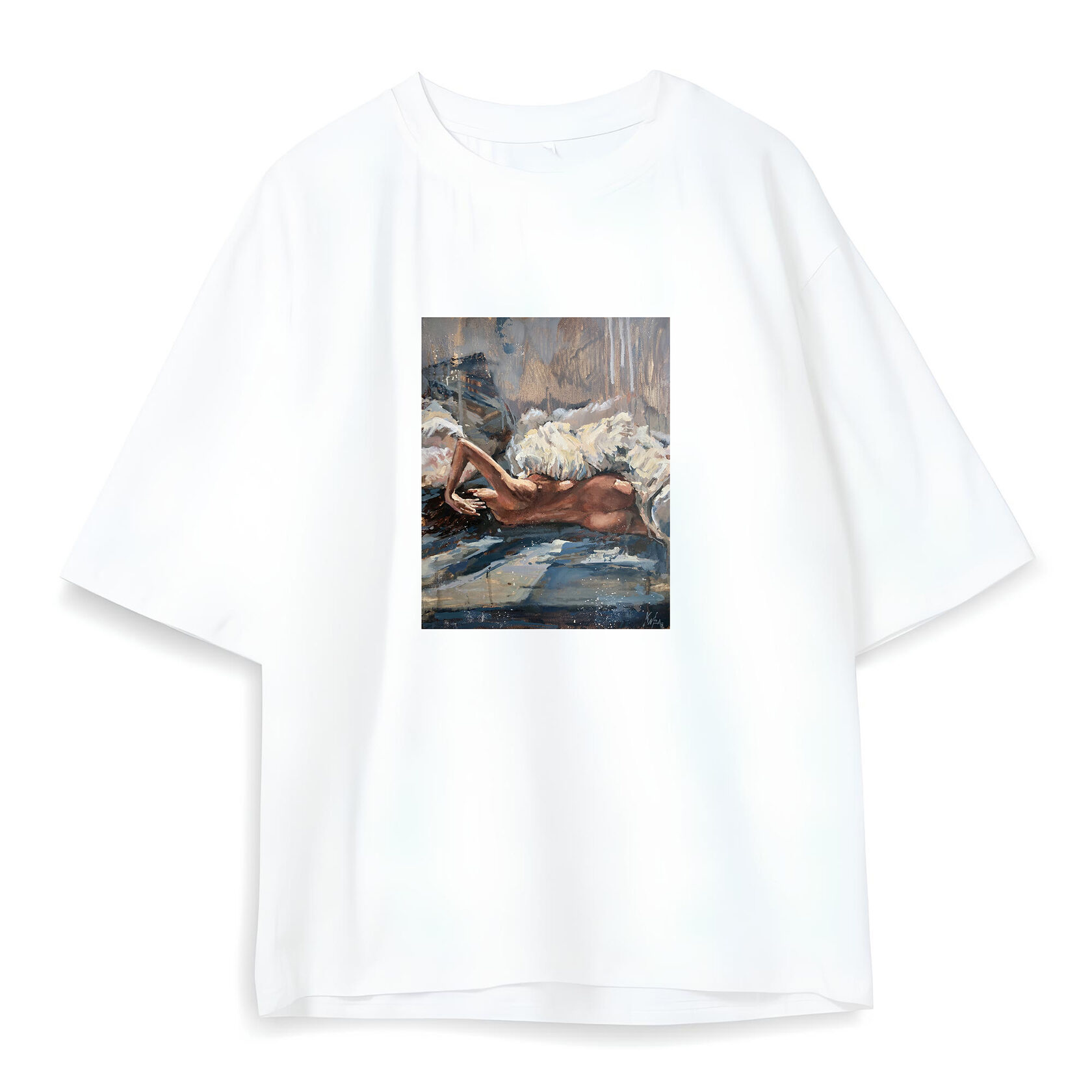 Футболка, крой оверсайз Художник: Кира Кривокобыльская 95% хлопок, 5% лайкра Размер: xs, s, m, l Цвет: черный, белый